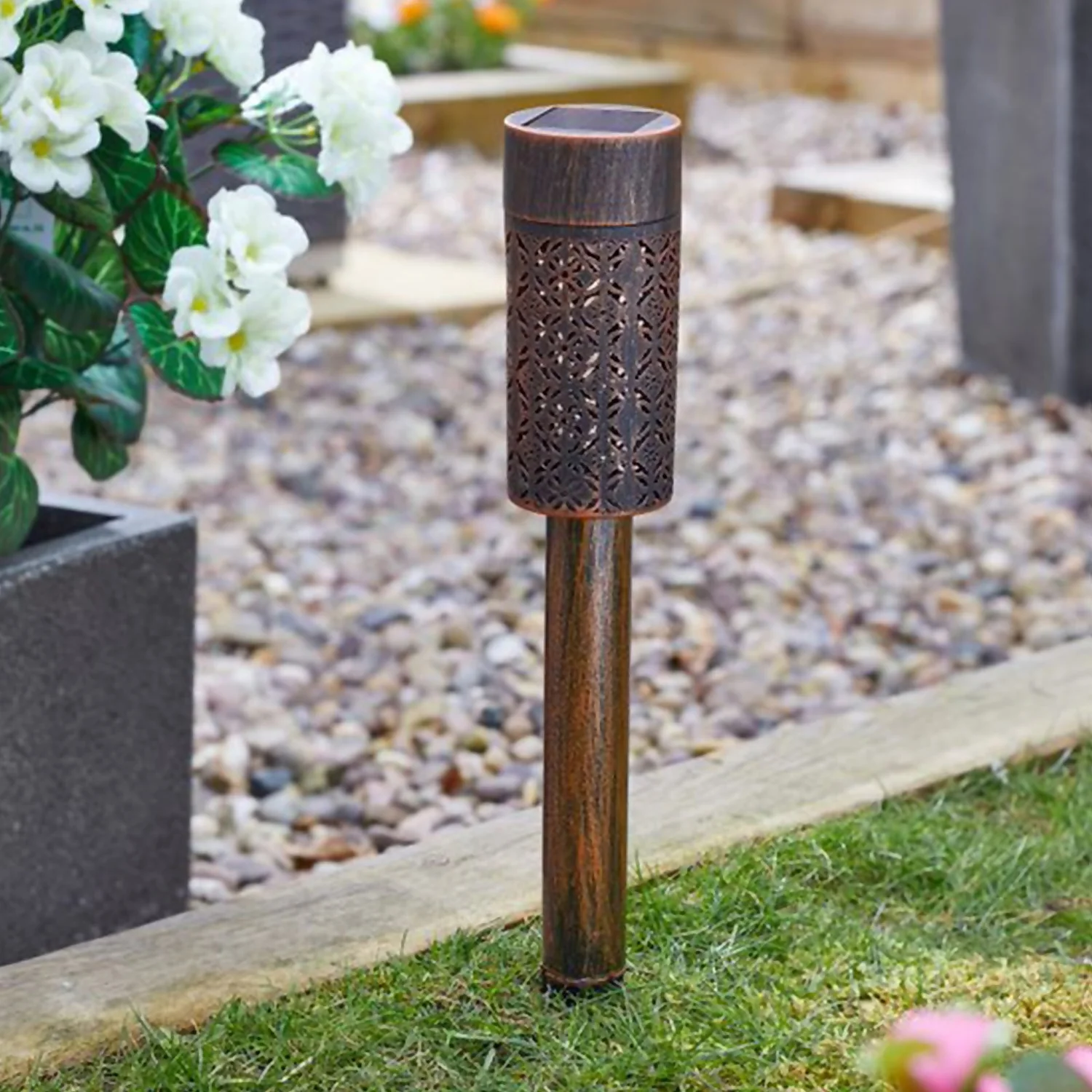 The Cairo stake lights create a stunning silhouette effect when lit.